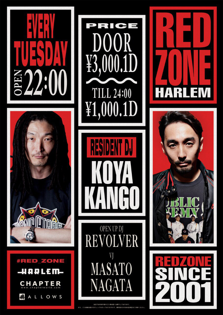 HIP HOPの聖地HARLEMにて毎週火曜に開催する東京最長寿イベント"RED ZONE" 音楽、ファッション、映像、全てのカルチャーにおいて最先端の潮流を取り入れ ながらオリジナルなスタイルを展開し、 国内外から広く話題を集める。