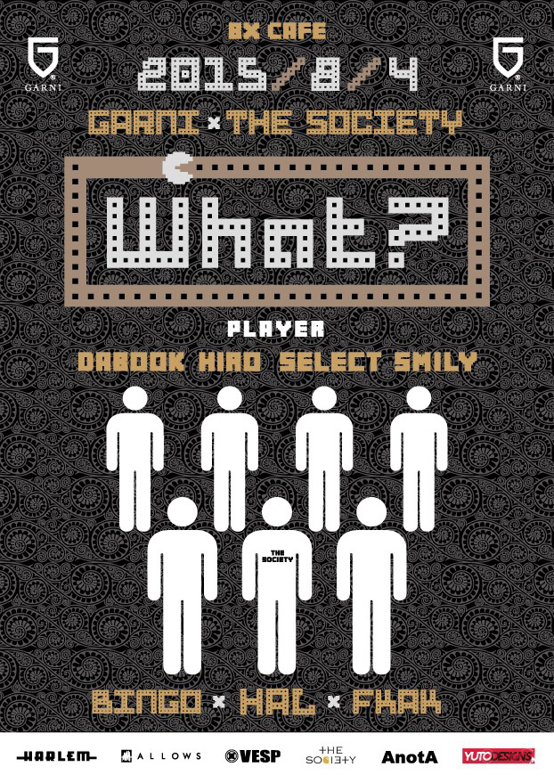 WHAT?@BX CAFE ■DATE: 9.1.TUE ■TIME: 22:00-MIDNIGHT ■DOOR: 3000.1D 1000.1D[TILL 24:00] ■LINE UP -DJ- HAL BINGO FKAK HIRO SELECT DaBook SMILY ■DETAILS "大人な空間"をコンセプトに百戦錬磨の7人が集まった"WHAT?" 何が入ってるかわからないWHAT?ボトルには要注意!!
